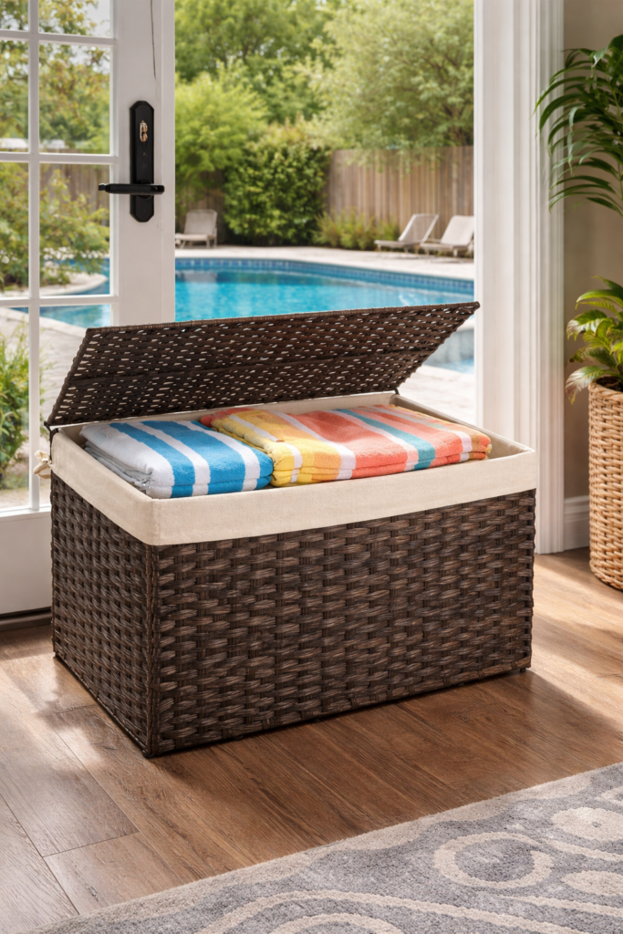 Pool towels take up far more space than standard linens, so a large woven storage basket with a lid or an XXXL cotton rope basket provides the capacity you actually need.